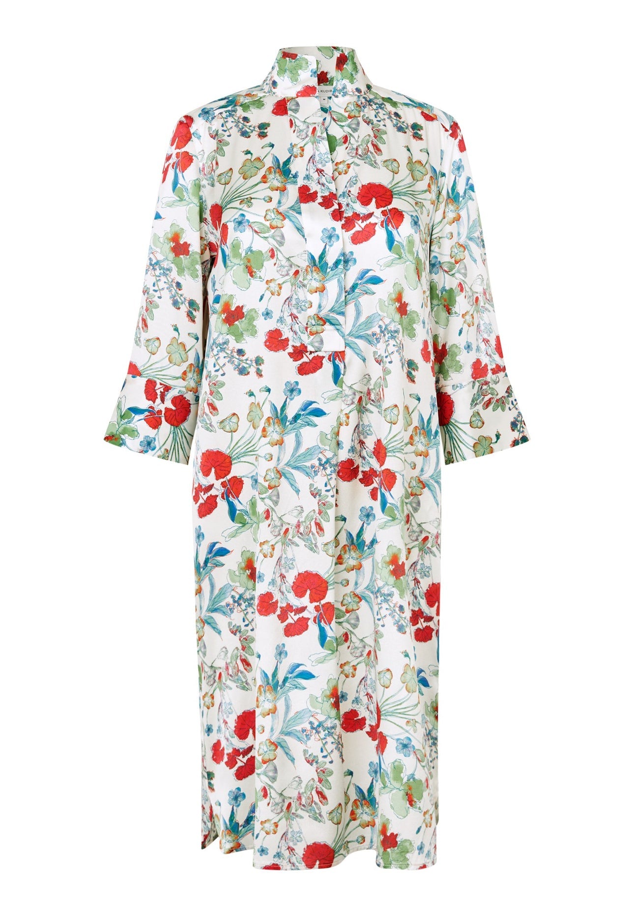 Mid calf length silk dress with a kimono neckline and wide sleeves with covered buttons. An elegant dress suitable for special occasions or dress down with flats for a more casual look.