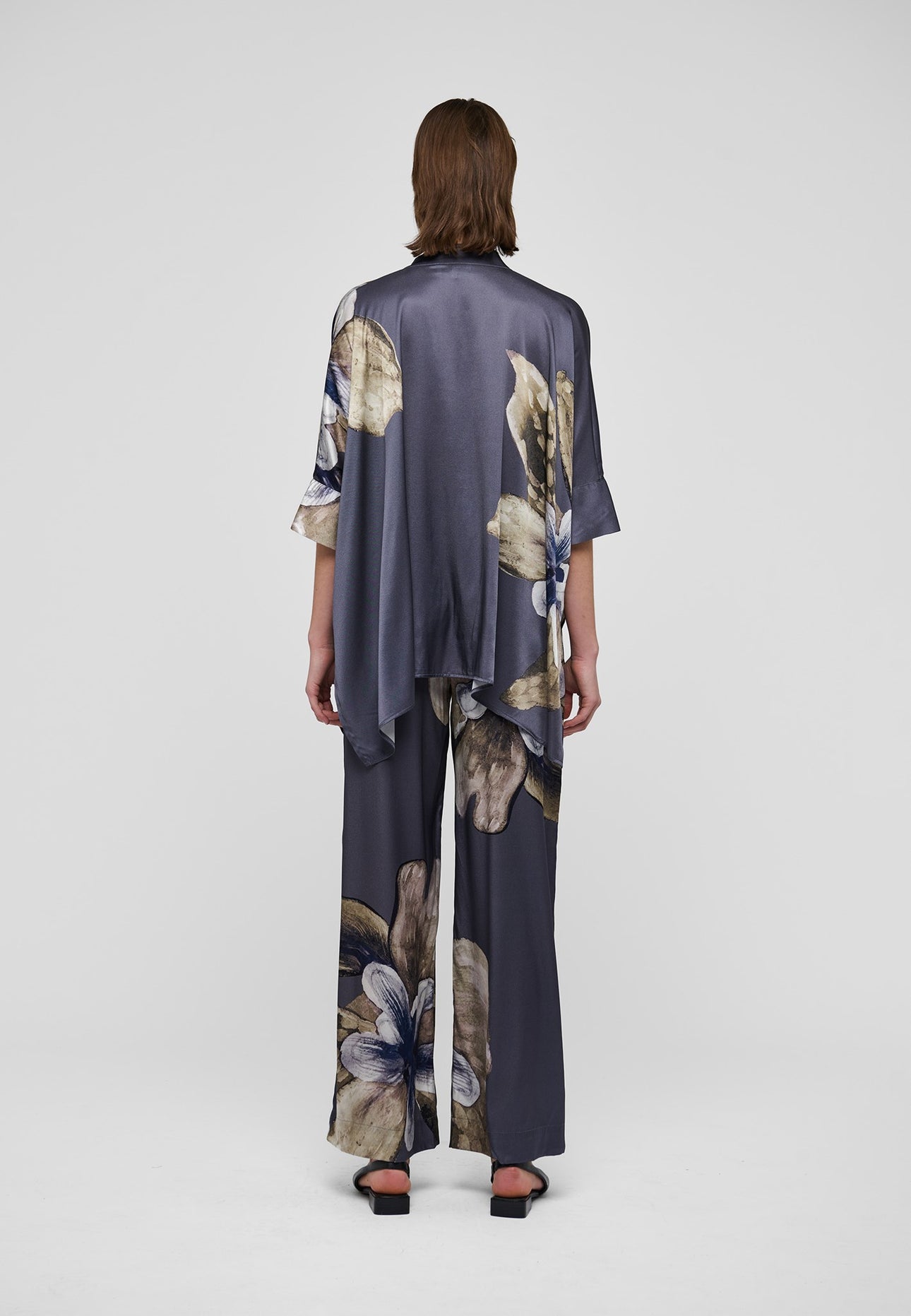 Loose silk pants in a bold oversized flower print. They have a wide elastic waistband. Wear with the matching blouse or dress down with a simple top or knit.